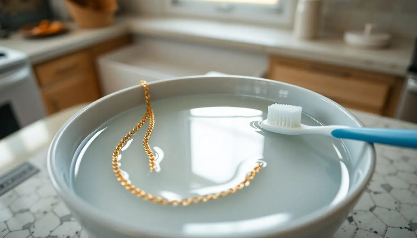 Dish soap and warm water create a gentle cleaning solution for gold chains. Mix a few drops of mild dish soap in a bowl of warm water. Soak the gold chain in the mixture for about 15 minutes. Use a soft toothbrush to gently scrub any stubborn areas. Rinse the chain under running water to remove soap residue, and then dry it with a soft cloth. This method works well for light tarnish and grime buildup.